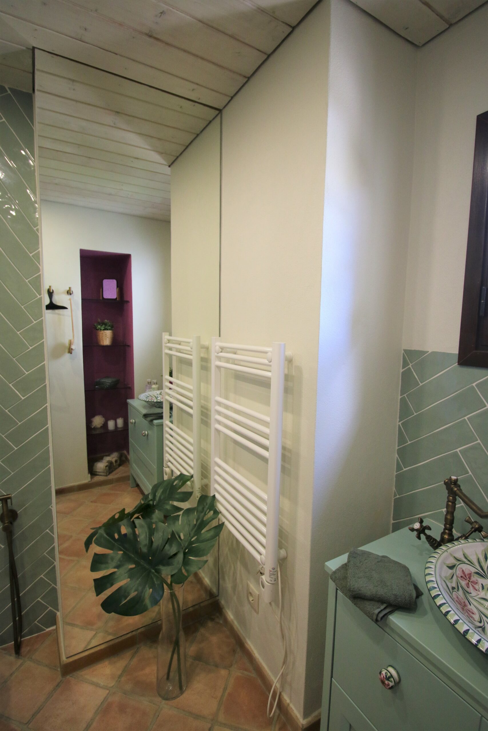 The master bathroom proposal will have a vanity unit with legs, more classical but at the same time modern with two oval sit on basins in ceramic in a very beautiful stone guatemala green worktop and splashback.