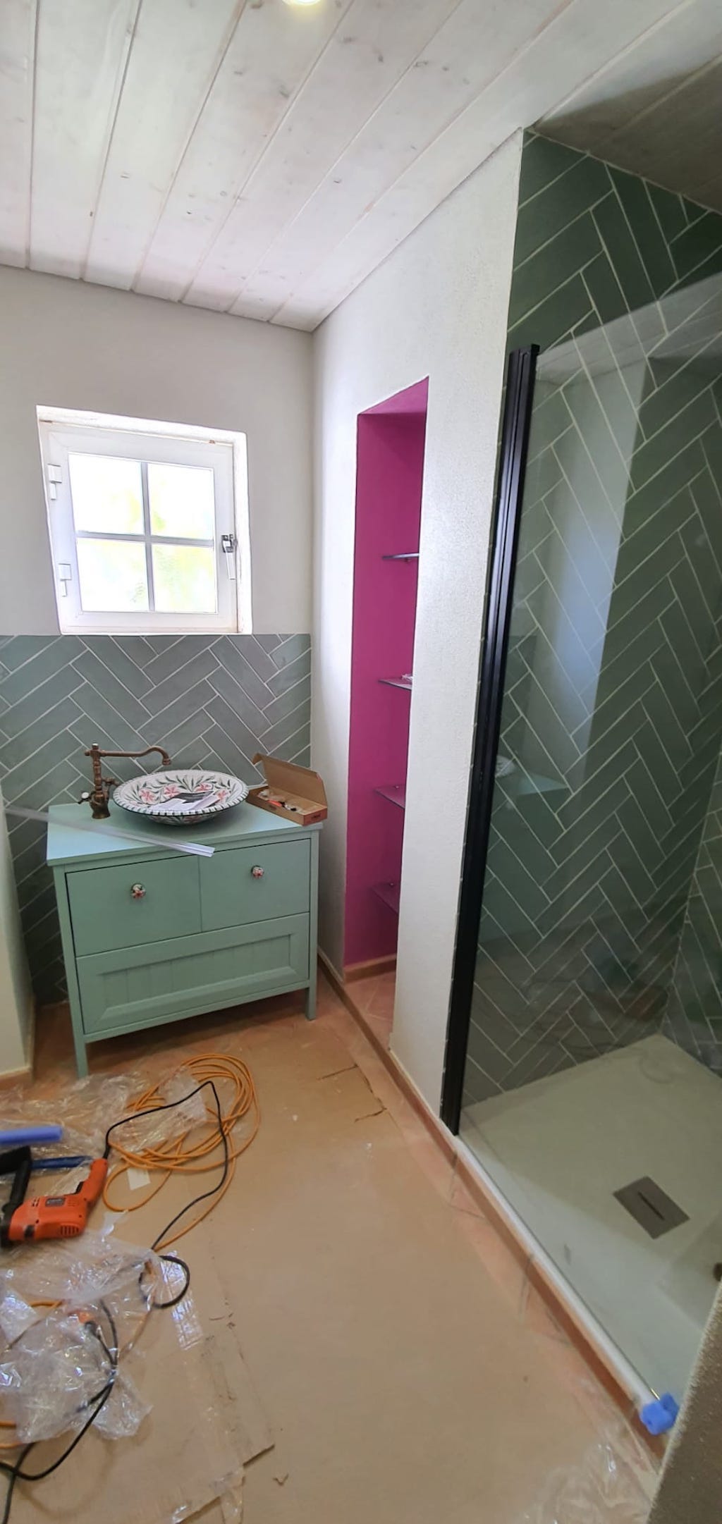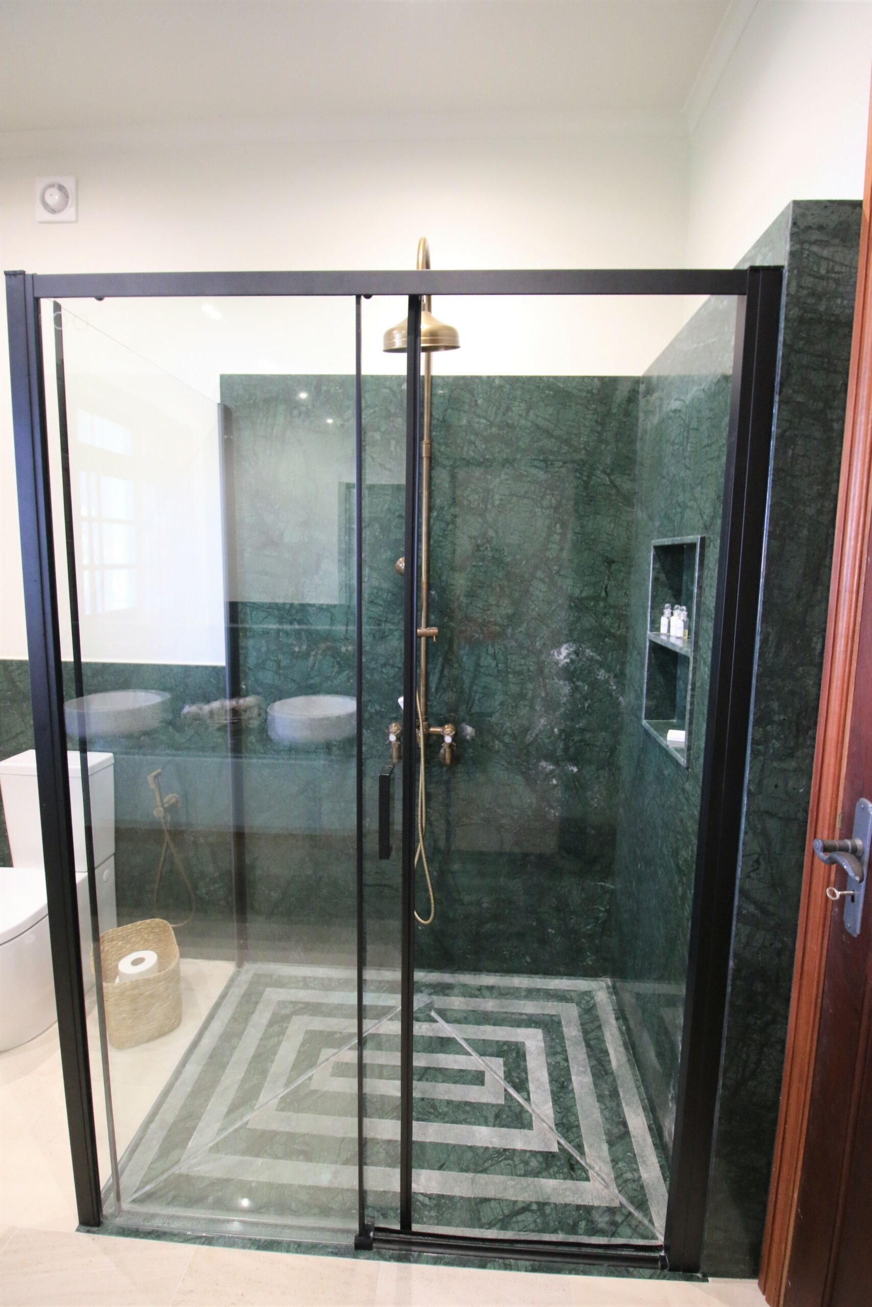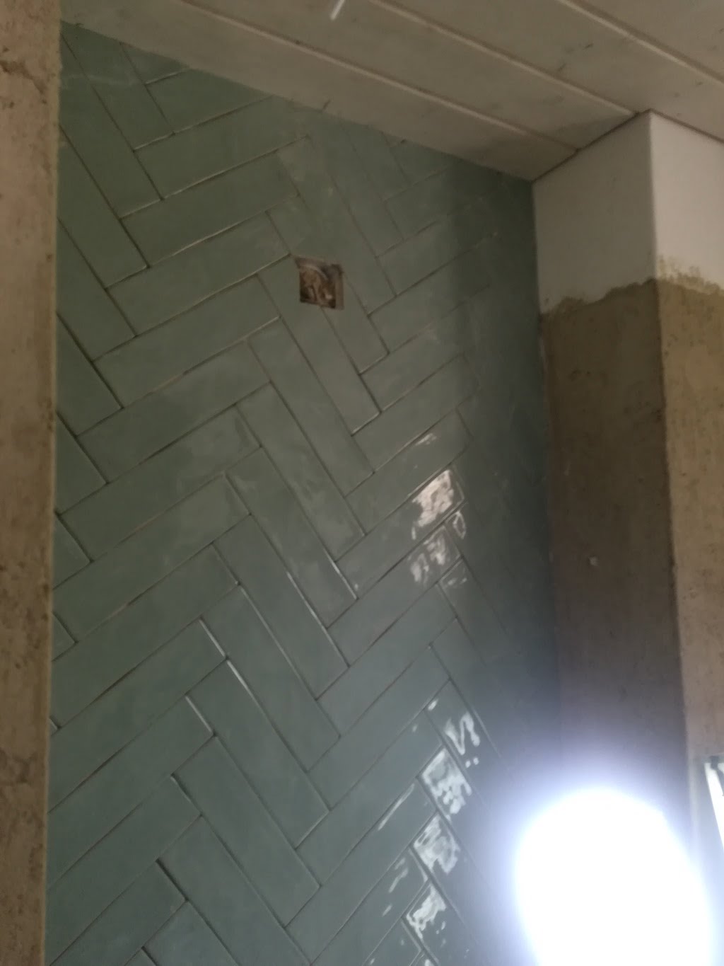 The shower will be all in the same stone guatemala green with two shelves for shampoos and shower gel products.
